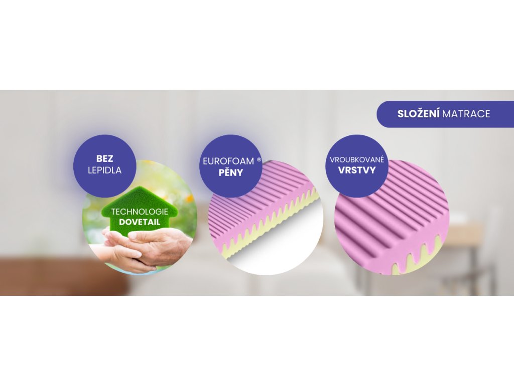 Způsob spojení vrstev matrací technologií DoveTail, založené na kombinaci fyzikálně-mechanických spojů, kde se využívá tření. Vzhledem k velké kontaktní ploše a vysokému koeficientu tření použitých pěn, je spojení velmi stálé.