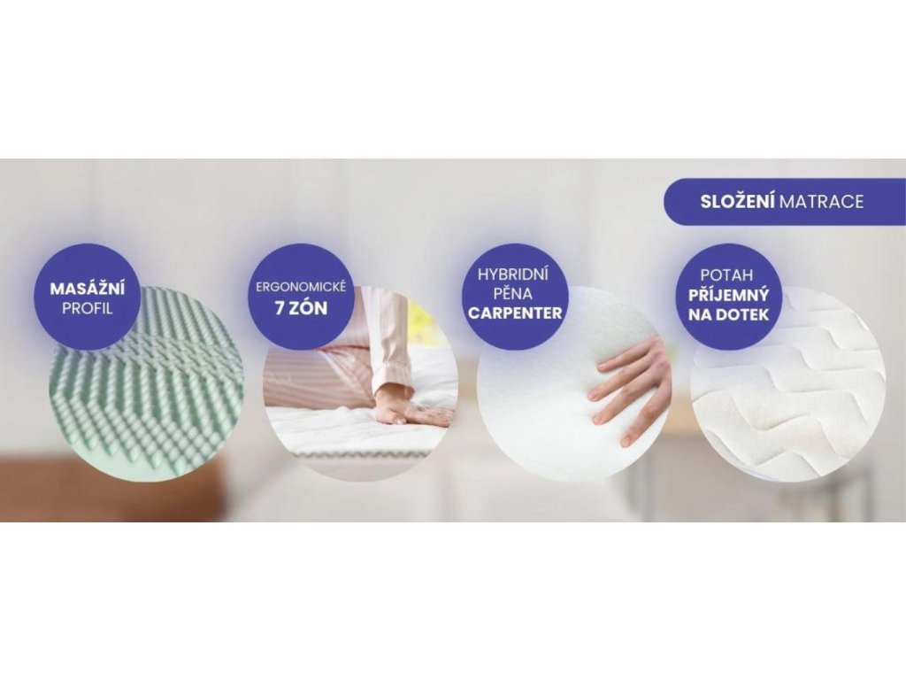 Pěna Carpenter, použitá jako klíčový materiál v naší matraci, je pečlivě vyvinuta pro poskytnutí optimální elasticity a adaptability během spánku. Tato pěna se vyznačuje schopností uvolnit svalové napětí, což přispívá k celkové relaxaci a kvalitnímu odpočinku. Je to klíčový prvek, který zajistí, aby vaše tělo během spánku získalo maximální podporu a pohodlí.