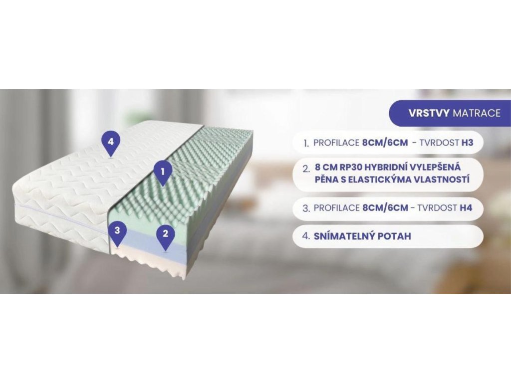 Jádro matrace tvoří 8 cm hybridní pěny typu RP30. Tato speciální hybridní pěna byla vyvinuta s důrazem na ergonomickou podporu a pohodlí spánku. Její elastické vlastnosti umožňují matraci přizpůsobit se tvaru vašeho těla, což minimalizuje tlak na klíčové body a zajišťuje správnou polohu páteře. Tato vrstva poskytuje optimální podporu bez pocitu zanoření do matrace, což zaručuje pohodlný a odpočinkový spánek po celou noc.